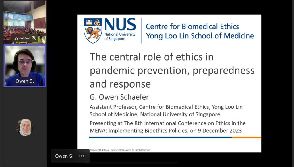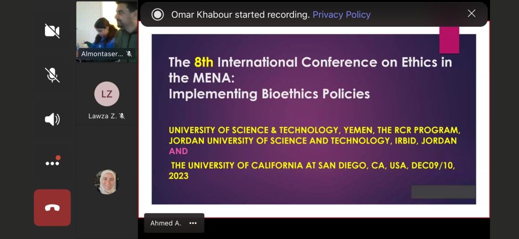 The 8th International Conference on Ethics in the MENA region, focusing on Implementing Bioethics Policies, convened scholars and experts from the University of Science & Technology in Yemen, the RCR program at Jordan University of Science and Technology in Irbid, Jordan, and the University of California at San Diego in the USA. Held on December 9th and 10th, 2023, the conference aimed to address crucial issues surrounding bioethics policy implementation. Discussions centered on fostering ethical practices in research and healthcare across the MENA region.
