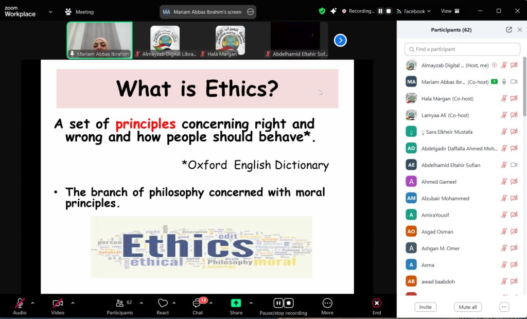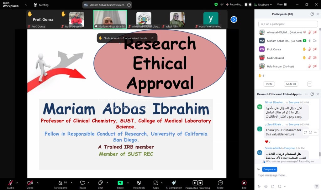 The fourth lecture, titled “Research Ethics and Ethical Approval,” was presented by the esteemed Prof. Dr. Mariam Abbas Ibrahim, a renowned academic figure in the field of Clinical Chemistry. She holds the position of Professor at the College of Medical Laboratory Science at the Sudan University of Science and Technology and is the Chairholder of the UNESCO Chair in Women, Science, and Technology at SUST. Prof. Ibrahim is also a Fellow of Responsible Conduct of Research at the University of California, San Diego.