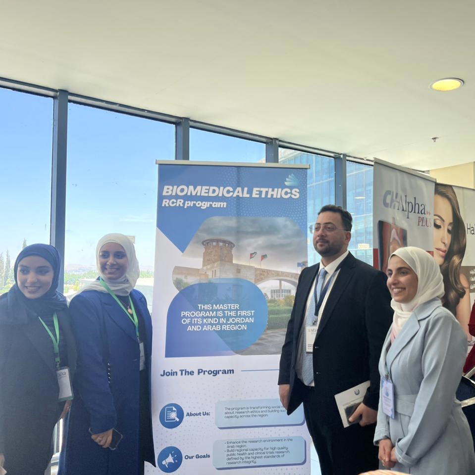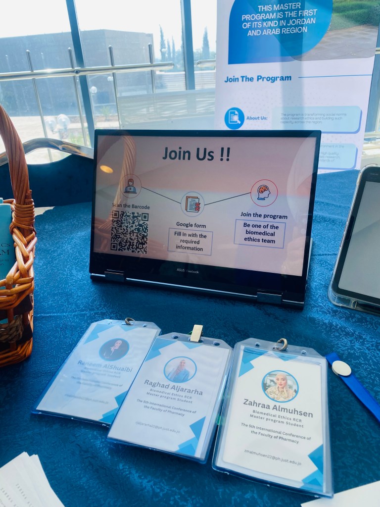 A group of Master students of RCR project who represent the first bunch of the accepted students to do their Master in biomedical ethics and bioethics in Jordan have conducted an information corner about RCR project during the Fifth International Conference of the Faculty of Pharmacy Entitled “Multidisciplinary Pharmaceutical Research” at Jordan University of Science and Technology. The conference was Under the patronage of the President of Jordan University of Science and Technology, Prof. Khalid El-Salem, the Fifth International Conference of the Faculty of Pharmacy “Multidisciplinary Pharmaceutical Research” started on Tuesday. Many researchers, specialists and experts in the field of pharmaceutical and therapeutic industries from Arab and international universities, from Jordan, the Emirates, Oman, Britain, Spain, America and Canada, participated in the conference.